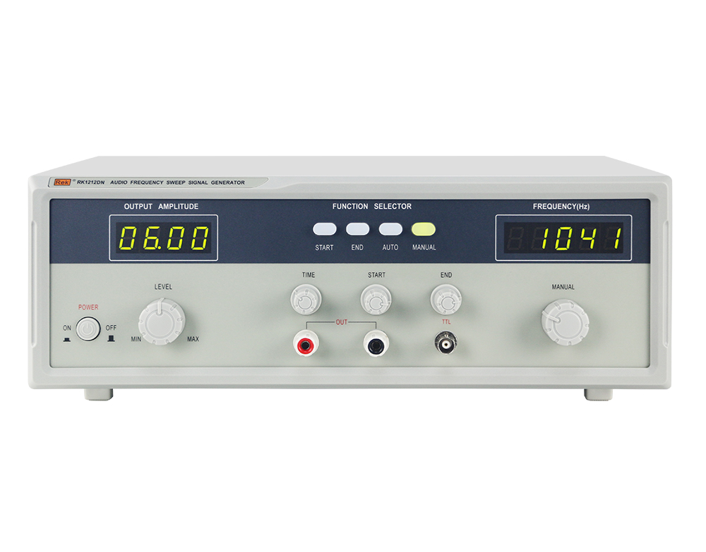 RK1212系列音頻信號發生器采用先進的壓控振蕩電路,產生穩定、低失真的正弦波信號。輸出幅度、頻率均采用數碼顯示、掃頻范圍可達1:1000以上,掃頻的起點和終點可任意設置,具有開機延時輸出、短路保護等功能。
