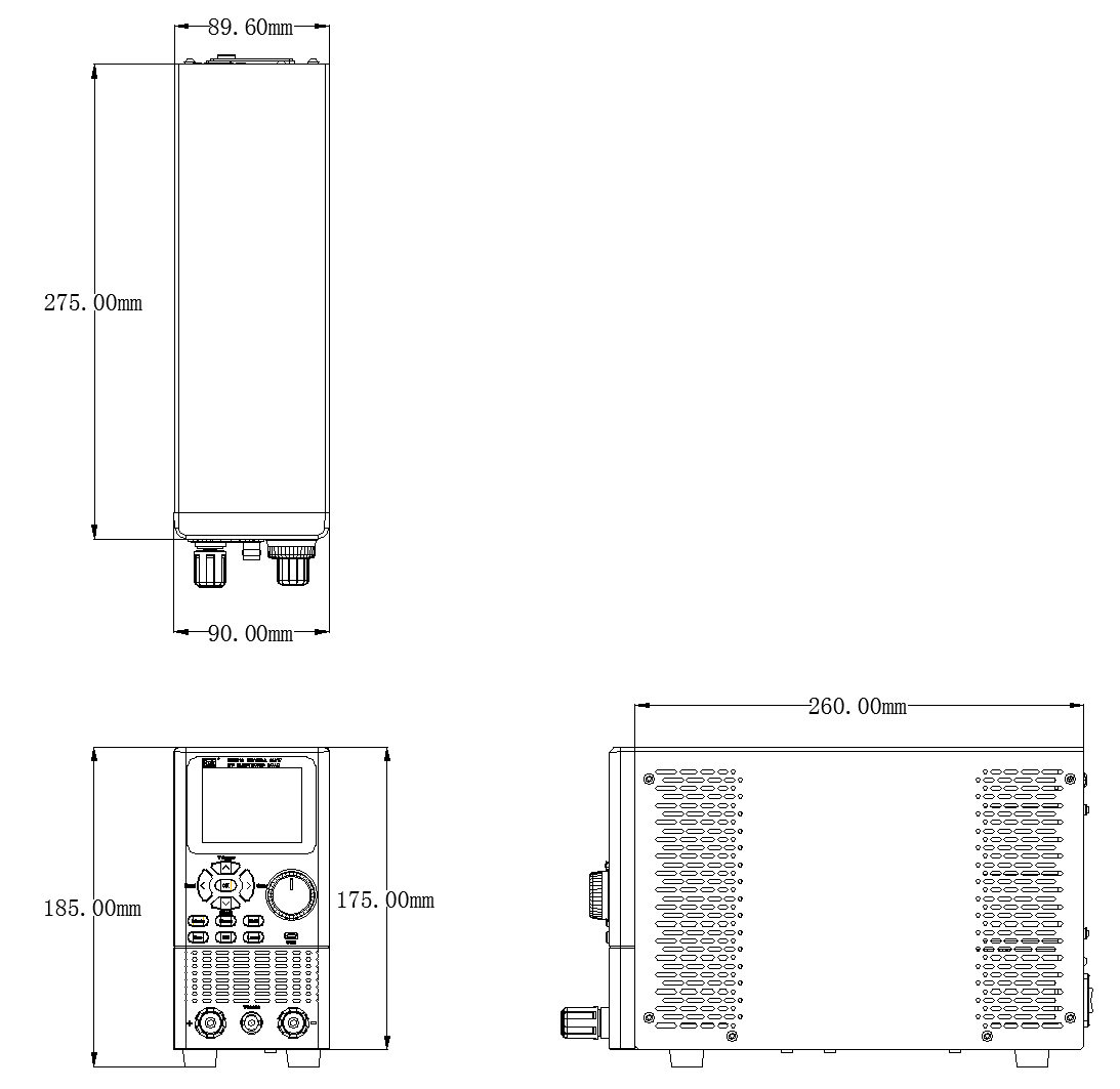RK8510/RK8510A/RK8510B/RK8510C/RK8510D系列直流電子負載三視尺寸圖